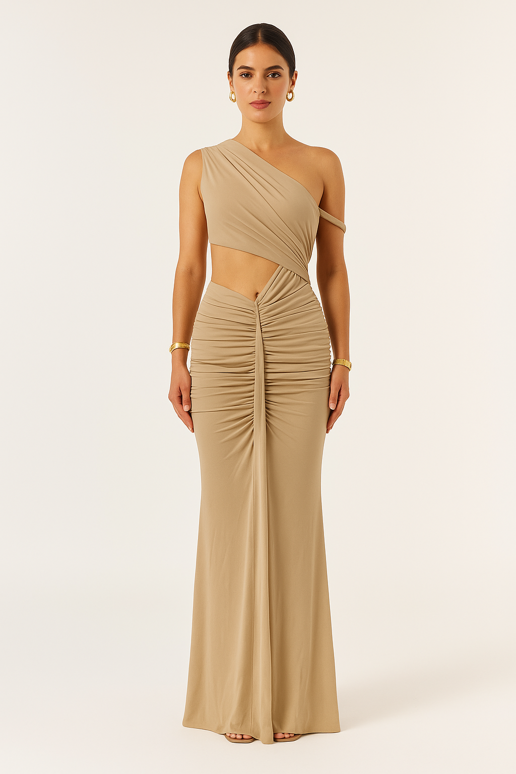 Just in time for Summer the versatile styling options, allowing you to wear it on or off the shoulders according to your preference. With ruching around the hips and a sheer skirt it beautifully accentuates feminine curves, making it a flattering choice for any event.