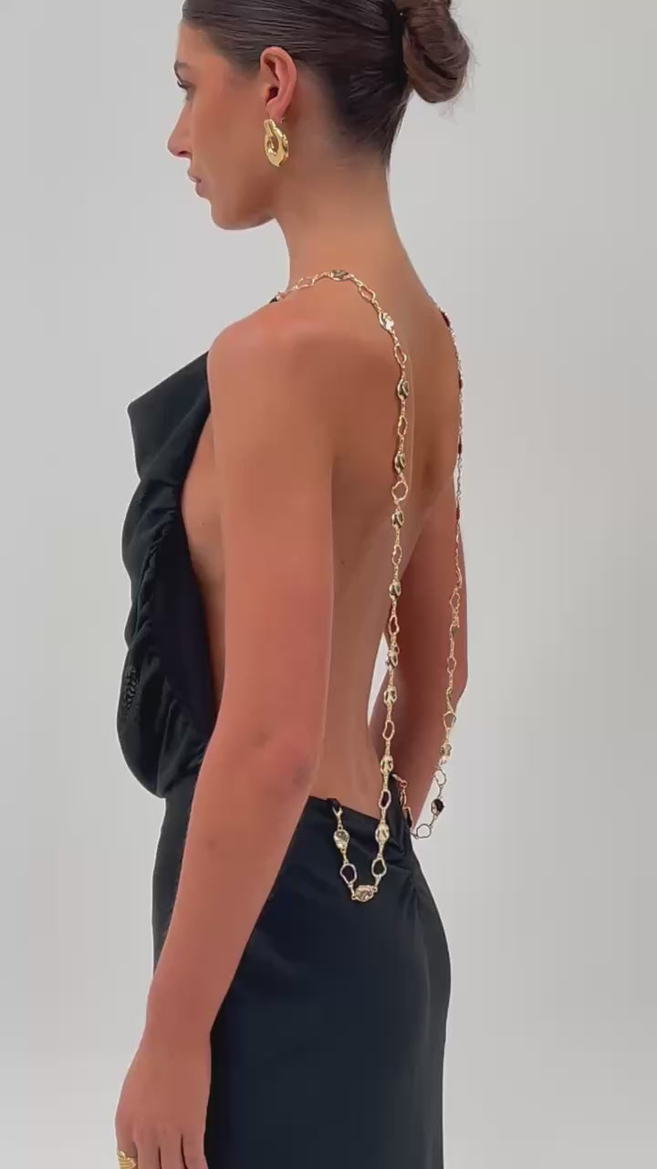 Effortless elegance meets daring detail. The NERINA Maxi Dress is crafted from a soft black mesh that drapes beautifully across the body, featuring a high cowl neckline and ruched bodice for a sculpted silhouette. The show-stopping open back is adorned with delicate gold embellished chain straps, which can be clasped and styled multiple ways to suit your mood or occasion.