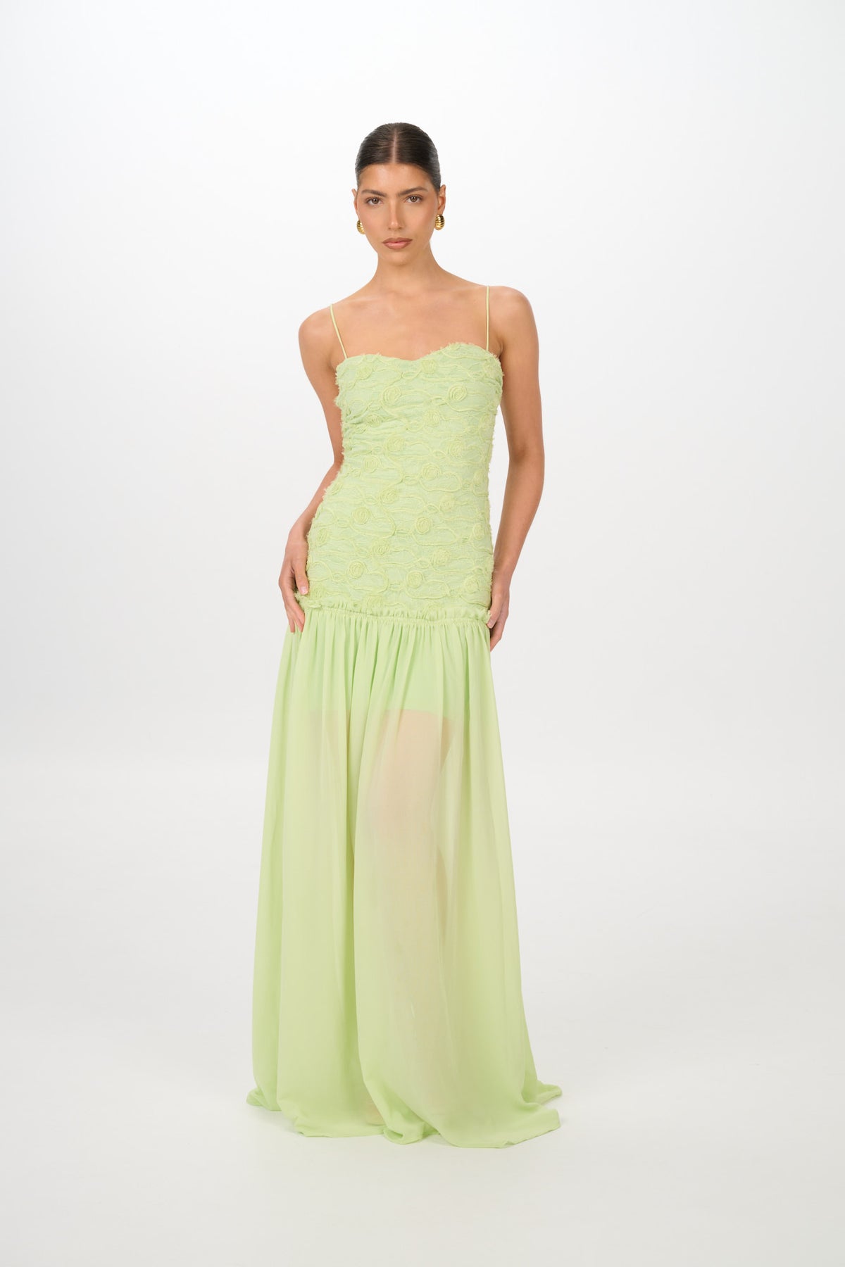 The Renata Dress features a structured rosette-embroidered bodice that delicately contours the silhouette, suspended by fine shoulder straps for an understated elegance. Flowing from the waist, a soft chiffon skirt cascades effortlessly to the floor, creating subtle movement with every step.
