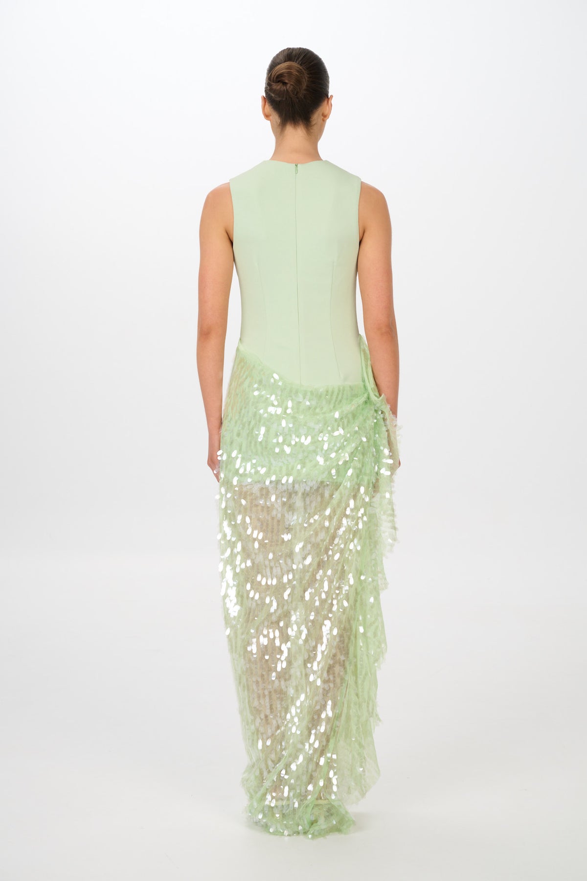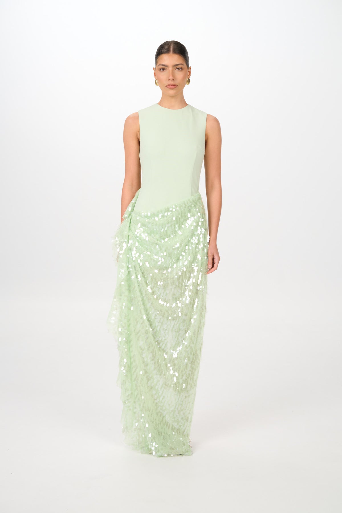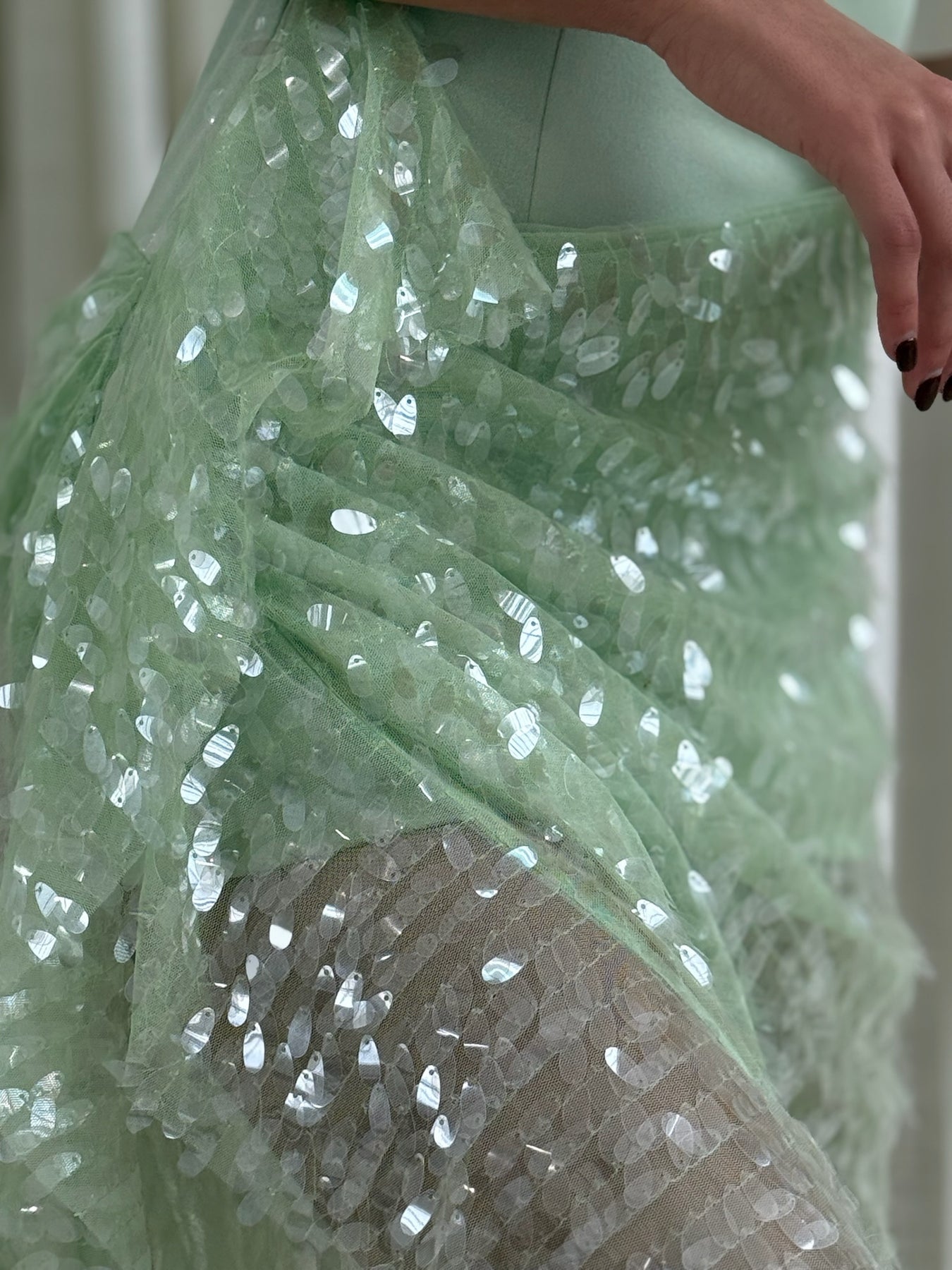 The ZOI Mini Dress embodies quiet confidence and unspoken glamour. Cut from a soft crepe that sculpts the upper body with precision, it flows into a beautifully sequined, draped skirt that catches every light with intention. The full back zip ensures a seamless fit — refined, sensual, and unapologetically powerful.